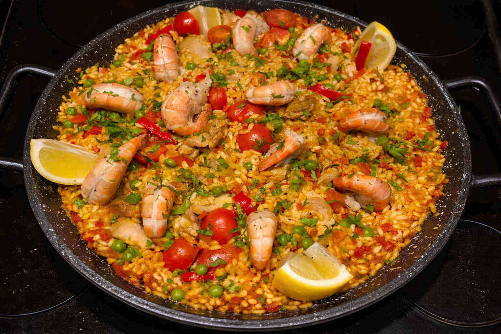 Chicken, chorizo and prawn paella by Michael Catling 5 June 2025 Skip to Recipe Print Recipe 1.1K Tender chicken thighs, spicy chorizo and succulent king prawns come together in this saffron-infused paella that is studded with peppers, peas and cherry tomatoes. A paella is such a wondrous thing, isn’t it? The mixture of colours and spice, the gorgeously crispy bottom, and all those little surprises that sit nestled among the saffron-infused rice. It is one of those dishes that demands plenty of attempts to really nail the socarrat (the caramelised crust that everyone loves), but I can’t imagine anyone would ever get bored of eating paella on repeat. There are so many variations in Spain that you can go all in on the seafood or even swap out the proteins for a vegan-forward paella. To keep the meat and seafood lovers happy, I’ve opted for a classic paella mixta – a combination of chicken, chorizo and king prawns – and bulked it out with peppers, peas and cherry tomatoes. My recipe serves 4 generously and is best served at the table, so everyone can help themselves and fight over the last remaining prawns. Below, I’ve shared a few of my favourite tips and tricks to help you nail the cook on the paella (and socarrat) first time. If you have any questions of your own, let me know in the comments section below! How To Make My Chicken, Chorizo And Prawn Paella Chef Catling’s recipe notes Recipe: Chicken, chorizo and prawn paella Frequently asked questions Tips & Notes To Know Use a wide, shallow pan: You’ll be pleased to know that an authentic paella pan is not essential, but you can’t get away with using a deep pot or casserole dish. Both are designed to trap steam which will then ruin the rice’s texture. Don’t stir after adding the stock: You’re not making a risotto here. Once the broth is in, hands off. You want a lively simmer, not a slow braise, so let the rice cook undisturbed to form the perfect texture. Cook with confidence: The caramelised bit at the bottom of the rice (socarrat) is the most prized part of a paella. It’s created when the rice absorbs the stock and the liquid evaporates, causing the bottom layer to crisp up. Listen carefully – you should hear a gentle crackling sound, not aggressive frying, towards the end of cooking. Visual check: You can see whether the socarrat has formed by gently lifting the rice with a spoon or spatula from the bottom. It should smell smoky, not burned, so trust your instinct and make sure you rest your paella after cooking. That will give the socarrat time to set properly. Chicken, chorizo and prawn paella Serves: 4 Prep time: 15 mins Cook time: 45 mins 45 mins Pin Print Ingredients Large pinch of saffron1 tbsp olive oil400g skinless chicken thighs, cut into small chunks1 large brown onion, finely chopped100g chorizo (mild), diced1 red pepper, cut into small chunks3 garlic cloves, crushed1/4 tsp celery salt1/2 heaped tbsp smoked paprika300g Spanish paella rice600ml hot chicken stock1 x 400g can chopped tomatoes100g large handful of cherry tomatoes, halved12 raw king prawns, shell on100g frozen garden peas To ServeSmall handful of fresh flat-leaf parsley, finely chopped1 lemon, cut into wedges Instructions Step 1Steep the saffron in a bowl with a splash of hot water and leave to infuse. Step 2Heat the olive oil in a paella pan or a deep frying pan. Add the chicken and fry over a medium-to-high heat until golden; about 4-5 minutes. Remove with a slotted spoon and set aside. Step 3Turn the heat down slightly and add the onion and chorizo to the same pan. Fry for about 3 minutes or until crisp and the chorizo oil has been released. Step 4Tip in the red pepper, garlic, celery salt and smoked paprika and stir-fry for a further 1-2 minutes. The pan should have lots of crispy bits on the bottom, which will add flavour. Step 5With the heat still quite high, stir in the paella rice and chicken so they are well-coated in the oil, then pour over the saffron-infused liquid, chopped tomatoes and the chicken stock, scraping up the sticky brown bits from the bottom of the pan with a wooden spoon. Step 6Cook vigorously for 3 minutes, then reduce to a low-to-medium heat so everything is gently simmering. This is not a risotto, so do not stir. Step 7After 20 minutes, shake the pan slightly and evenly distribute the cherry tomatoes, prawns and peas over the top. Cook for another 5 minutes or until the rice is tender, the prawns are just cooked through, and most of the liquid in the pan has been absorbed. Step 8Taste the paella – if the rice is still too chalky but the pan is dry, add a splash more stock and continue to cook. If it’s too soupy, increase the heat to cook off the last of the liquid. Step 9For the last 3 minutes, increase the heat slightly to medium-high. Listen for a gentle crackling sound—that’s the socarrat forming. You'll know it's done if the bottom feels slightly resistant when nudged with a spoon. If unsure, tilt the pan slightly—if it’s dry and crackly at the bottom, you’ve nailed it. Step 10Remove the pan from the heat and cover with a tea towel or foil. Leave to sit for 5 minutes. Season generously with sea salt and scatter over the chopped parsley. Step 10Serve the paella straight from the pan, with lemon wedges on the side for squeezing over. Did You Make This Recipe? Tag me on Instagram at @Chef_Catling. Frequently Asked Questions Can I Use Basmati Rice Instead Of Bomba Paella Rice?I wouldn’t recommend that you do. Short-grain rice like Bomba rice is favoured due to its ability to absorb a lot of liquid (around three times its volume in liquid) without becoming mushy, which gives paella its signature texture. Basmati rice does not absorb liquid in the same way and because the grains tend to remain separate and fluffy, that makes it really challenging to form that delicious crispy layer at the bottom. What Should I Do If My Paella Rice Is Still Chalky After Cooking? Add a little extra stock or wat