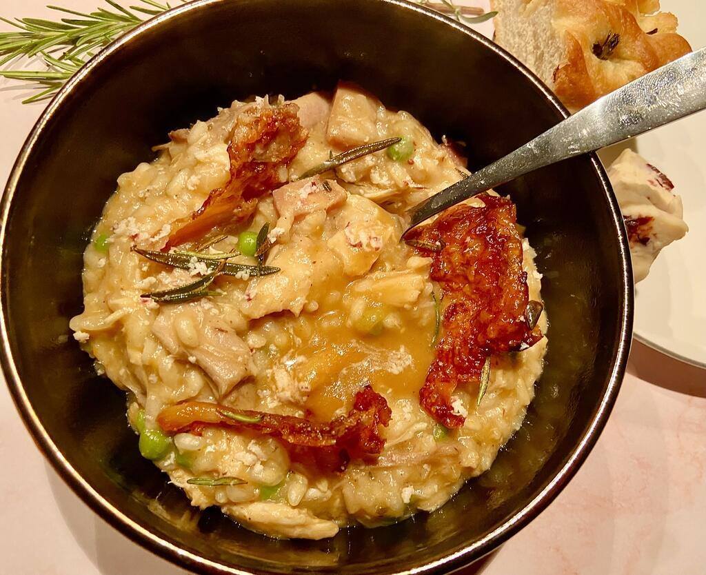 Leftover turkey and gammon risotto by Michael Catling 8 November 2025 Skip to Recipe Print Recipe 142 Turn your Christmas day leftovers into tomorrow’s main by repurposing the gravy, gammon stock and the leftover turkey and ham to make this dreamy risotto. I refuse to let any leftovers go to waste and this is probably my favourite way to repurpose all the wonderful leftovers from your Christmas dinner and Boxing Day buffet. To do it properly, you need to use a combination of gravy and gammon stock to cook the risotto, before stirring in flakes of gammon and turkey at the end. I like to grate over a healthy portion of wensleydale, but any leftovers from your cheeseboard will work wonders and produce the most indulgent risotto you’ve ever tasted. How To Make Leftover Turkey And Gammon Risotto Chef Catling’s recipe notes Recipe: Leftover turkey and gammon risotto What’s the secret to a great risotto – must read Tips & Notes To Know A Christmas day dinner in risotto form: I used turkey and gammon, but any combination of meat, gravy or stuffing would work just as well. Be careful with the salt: Gammon is naturally very salty, so be sure to taste the risotto before you add any extra seasoning. Leftover turkey and gammon risotto Serves: 2 Pin Print Ingredients 200g leftover turkey100g gammon, finely chopped1/2 tbsp olive oil, plus extra for flash-frying1 small white onion, finely chopped1 tsp fresh thyme leaves, finely chopped1/8 tsp celery salt150g carnaroli risotto rice450ml gammon stock250ml leftover turkey gravy, plus 50ml to serve1 sprig fresh rosemary, leaves picked60g frozen peas1/2 tbsp cream cheese20g Wensleydale with cranberries, finely grated Instructions Step 1In a bowl, shred the turkey meat into strips and reserve the skin. Step 2Heat the olive oil in a shallow sauté pan over a low-to-medium heat. Add the onion and gently cook for 10-15 minutes or until the onion is soft but not coloured. Add the thyme leaves and celery salt and cook for 1 minute more. Step 3Pour the gammon stock and turkey gravy into separate saucepans and bring to a simmer on a low heat. Step 4Turn the heat up slightly under the onions and add the carnaroli risotto rice. Toast the grains for 2-3 minutes, stirring constantly, until the edges of the rice look slightly translucent. This will help to crack the grains so they absorb the stock better. Step 5Add a ladleful of gammon stock to the risotto and cook over a low-to-medium heat, stirring often, until nearly all the stock has been absorbed. Gradually add the remainder of the stock a little at a time, followed by the gravy. Continue to simmer and stir regularly but not constantly. Step 6Meanwhile, place a small frying pan over a medium-high heat and add the turkey skin. When it starts to sizzle and release its fat, add the rosemary leaves and toss to coat. Continue to fry until the turkey skin is golden and crisp; about 2 minutes. Pat the turkey skin and rosemary dry on kitchen paper and set aside. Step 7With 3 ladlefuls of gravy left, add the gammon and turkey to the risotto and stir to combine. Step 8By the time the final ladleful of gravy has been absorbed, the risotto should be creamy and plump with a slightly chalky bite – the packet usually says this takes about 20 minutes but it's more like 30 minutes so keep tasting. If the grains are still undercooked, add a splash of hot water and continue to cook, stirring often. Step 9To finish the risotto, stir in the peas and continue to cook for 1 minute. Season to taste with salt and pepper, then remove the pan from the heat and stir in the cream cheese and grated Wensleydale cheese. Step 10Cover with a lid and leave the turkey and gammon risotto to sit for 5 minutes before dividing between bowls. Create a little well in the centre for the leftover gravy and garnish with the crispy rosemary leaves and turkey skin before serving. Did You Make This Recipe? Tag me on Instagram at @Chef_Catling. What’s The Secret To A Great Risotto? 1. Choose the right rice Long grain rice, like basmati or jasmine, should be nowhere near a risotto. You’ll find that most recipes call for arborio rice, but I prefer to use carnaroli because it produces the best texture (plus it’s harder to overcook). 2. Don’t rinse your rice Unlike with other types of rice, rinsing risotto rice serves no purpose. The natural starch that is present on the outside of risotto rice is what’s needed to thicken the dish and gives it that smooth, unctuous texture. By washing the rice, you are getting rid of the starch which will not only affect the texture, but also the cooking time and the consistency of the finished dish. 3. Use a wide, shallow pan Although I’ve made many risottos in my Le Creuset knock-off, I’ve found it far easier using a wide sauté pan, especially when cooking for my fiancée and I. The greater surface area means you can comfortably stir the rice and spread it more evenly across the base of the pan. 4. Toast the rice This step only takes a couple of minutes, but it us vitally important because toasting enhances the rice’s nutty flavour and helps the grains absorb the liquid more evenly. The rice should sizzle as it hits the pan. You’ll hear a slight popping sound as the rice toasts, but the key is to keep stirring so the grains don’t catch at the bottom of the pan. You’re looking for the grains to become slightly translucent around the edges, not browned. 5. Keep the stock on a rolling boil Adding cold stock is guaranteed to slow down the cooking process and disrupt the rice’s ability to absorb liquid. Instead, keep the stock simmering on the hob in a separate pot, so you can ladle it into the risotto without losing any temperature. 6. Add the stock gradually Refrain from tipping all the stock in at once. Add the liquid one ladleful at a time, and wait until the rice has absorbed most of the stock before adding more. This gradual absorption technique is key to developing the creaminess of the risotto